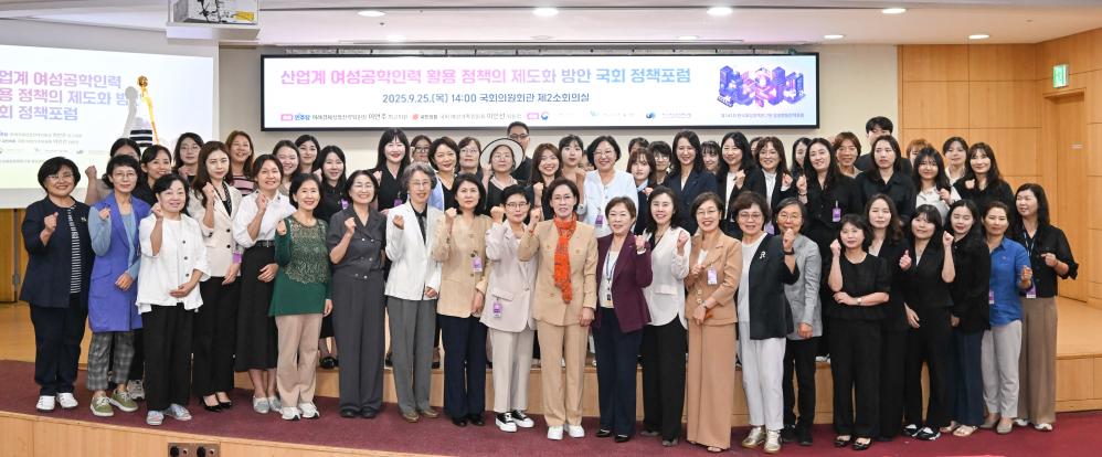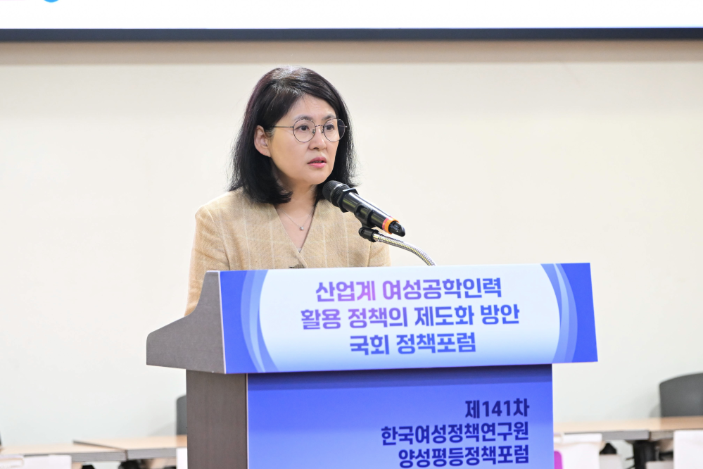 한국여성정책연구원은 한국여성공학기술인협회와 “산업계 여성공학인력 활용 정책의 제도화 방안”을 주제로 한 「제141차 양성평등정책포럼」을 9월 25일(목) 국회의원회관 제2소회의실에서 개최했다. 「국회 정책포럼」을 겸해 열린 이번 포럼은 더불어민주당 미래경제성장전략위원장 이언주 최고위원과 국민의힘 국회 여성가족위원회 이인선 위원장이 주최하고, 산업통상자원부, 한국여성공학기술인협회, 한국여성정책연구원이 주관하였다. 본 포럼에서는 산업현장에서 여성공학인력의 활용 실태와 문제점을 살펴보고, 이를 제도적으로 뒷받침하기 위한 법·제도 개선 방향을 함께 모색하는 시간을 가졌다.
