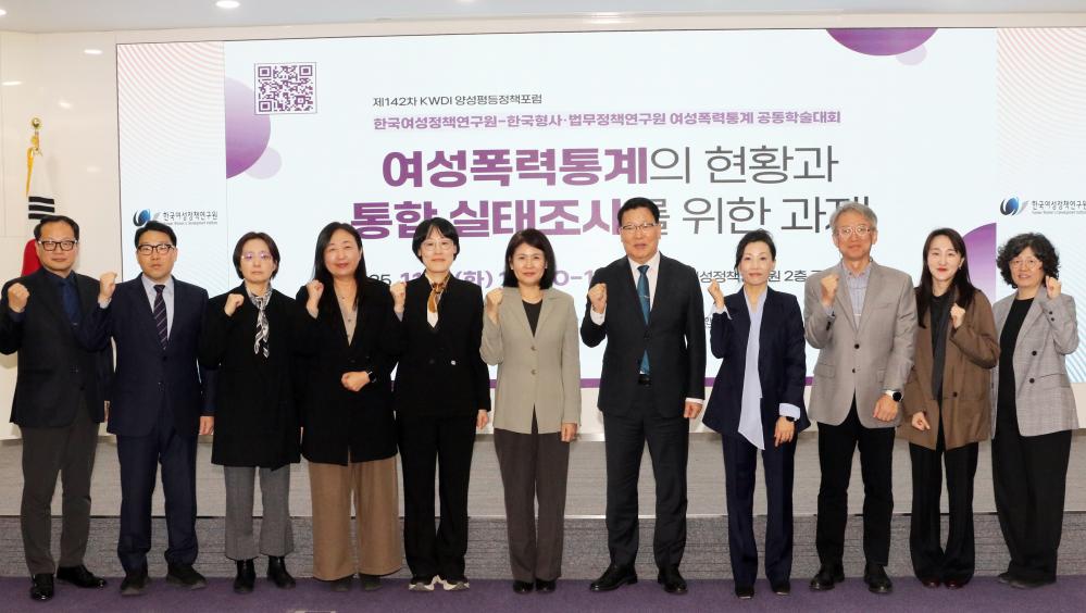 한국여성정책연구원은 한국형사·법무정책연구원과 “여성폭력통계의 현황과 통합 실태조사를 위한 과제”를 주제로 「제142차 양성평등정책포럼」을 11월 4일(화) 오후 2시에 한국여성정책연구원 2층 국제회의장에서 공동 개최하였다. 이번 포럼은 여성폭력의 실태를 보다 체계적이고 실증적으로 파악하기 위한 정책 통계의 방향을 모색하고자 마련되었으며, 한국여성정책연구원-한국형사·법무정책연구원 여성폭력통계 공동학술대회를 겸해 개최되었다.