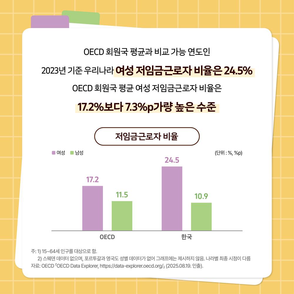 여전히.... OECD 회원국 중 성별 임금격차가 가장 큰 국가