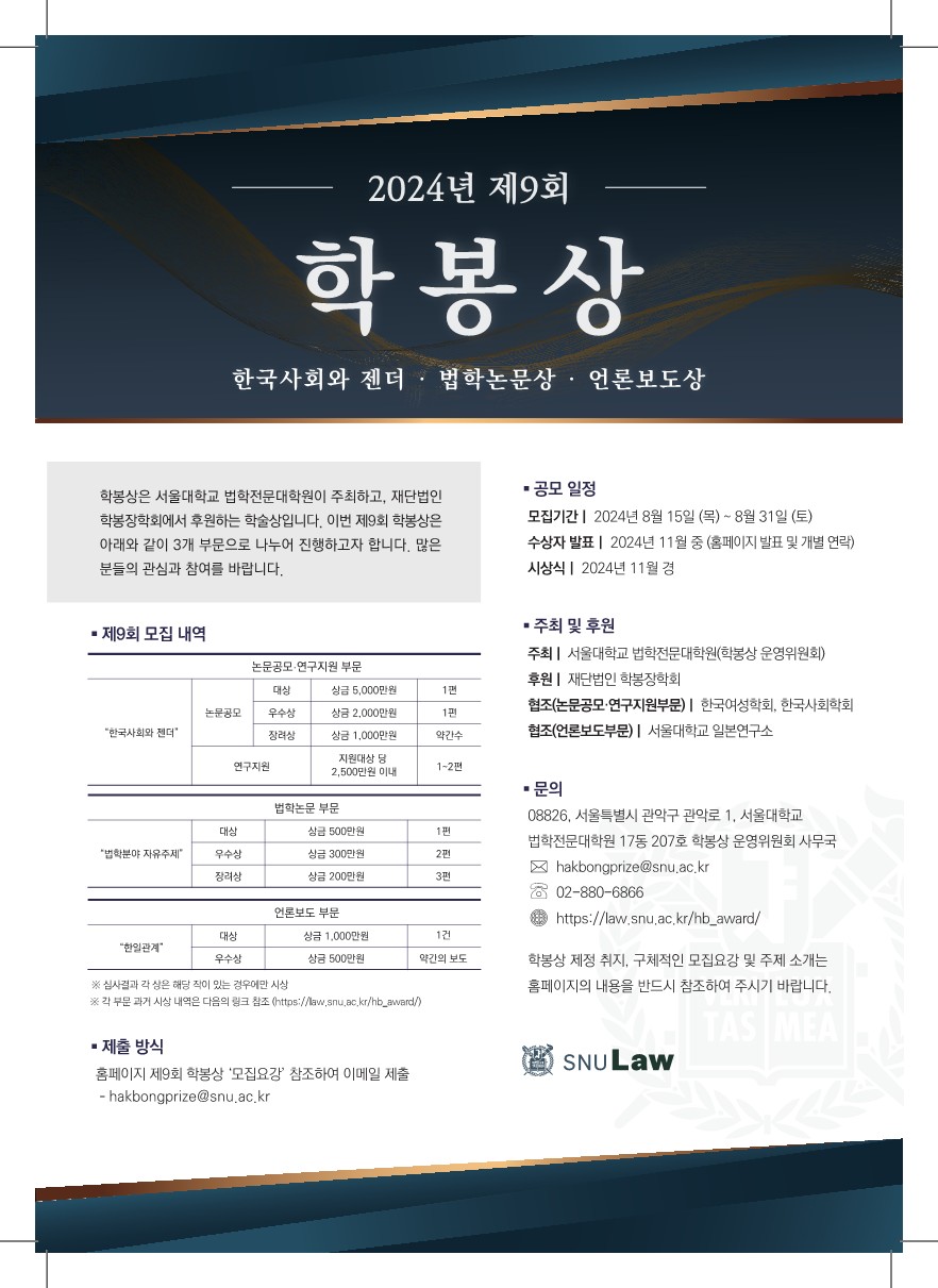 [서울대학교 법학전문대학원] 2024년도 제9회 학봉상 안내