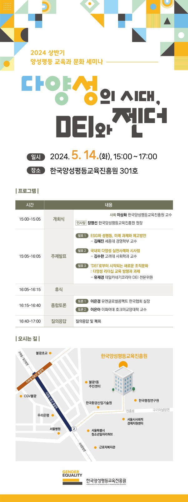[한국양성평등교육진흥원] 2024 상반기 양성평등 교육과 문화 세미나 - 다양성의 시대, DEI와 젠더