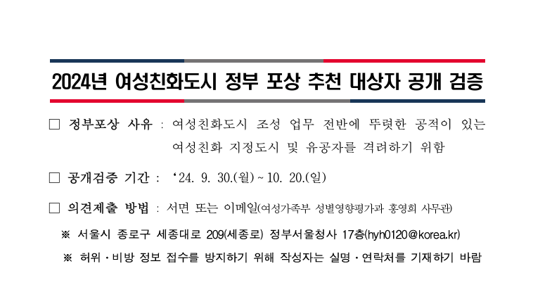 [여성가족부] 2024년 여성친화도시 정부 포상 추천 대상자 공개 검증