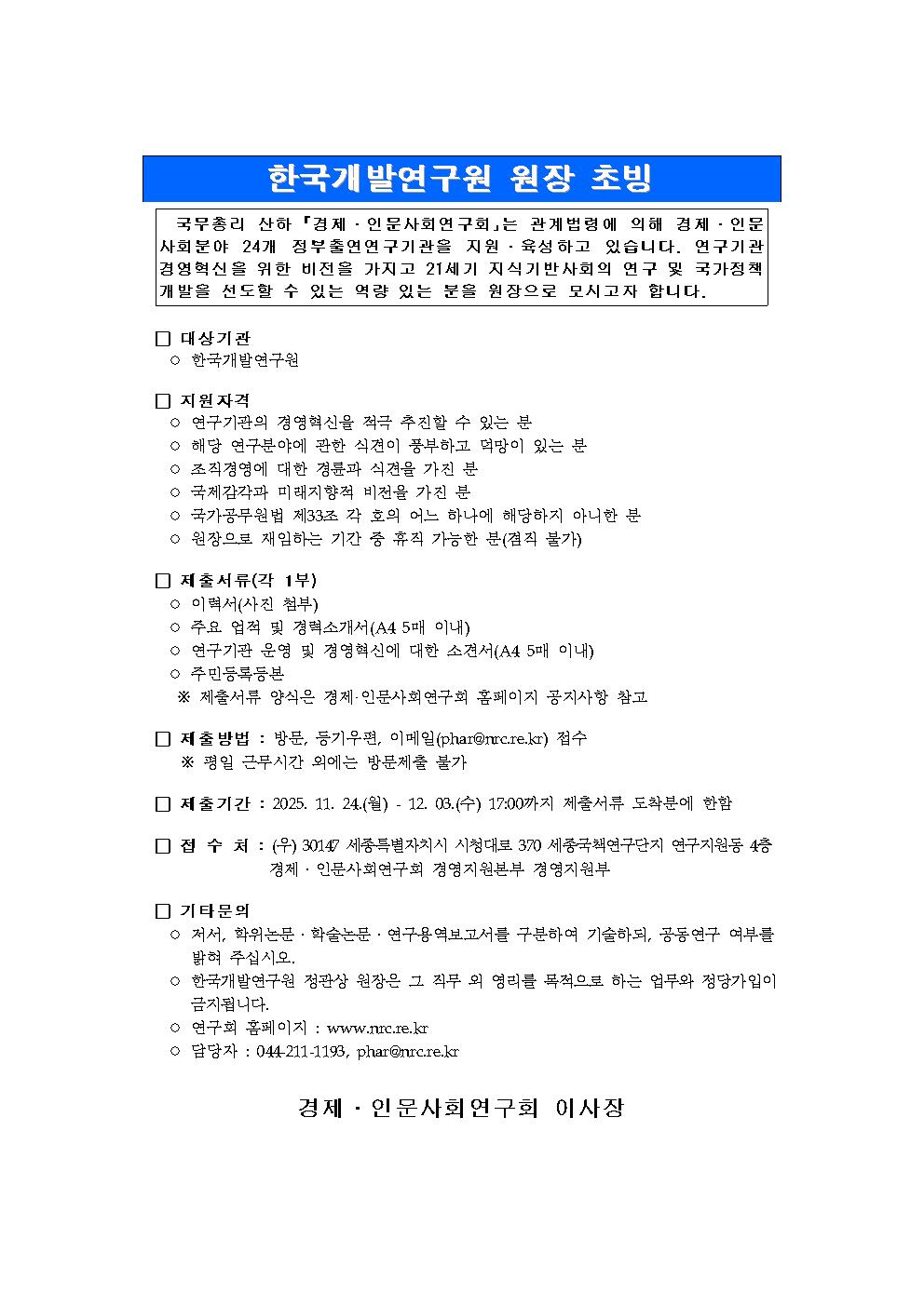 [경제인문사회연구회] 한국개발연구원 원장 초빙 공고