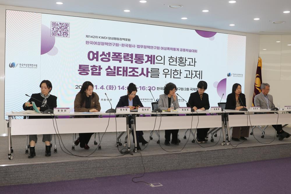 한국여성정책연구원은 한국형사·법무정책연구원과 “여성폭력통계의 현황과 통합 실태조사를 위한 과제”를 주제로 「제142차 양성평등정책포럼」을 11월 4일(화) 오후 2시에 한국여성정책연구원 2층 국제회의장에서 공동 개최하였다. 이번 포럼은 여성폭력의 실태를 보다 체계적이고 실증적으로 파악하기 위한 정책 통계의 방향을 모색하고자 마련되었으며, 한국여성정책연구원-한국형사·법무정책연구원 여성폭력통계 공동학술대회를 겸해 개최되었다.