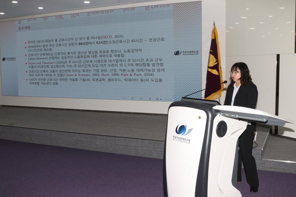 김안나 한국여성정책연구원 부연구위원이 "주 52시간 근로제의 도입이 기업의 고용과 자동화에 미치는 영향에 관한 연구"를 주제로 발표하고 있다.