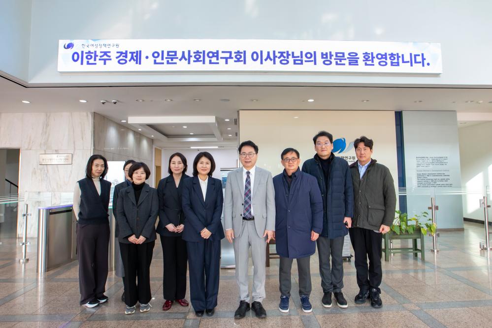 업무 보고가 끝나고 이한주 경제·인문사회연구회 이사장과 김종숙 원장을 비롯한 주요 참석자들이 기념촬영을 하고 있다.