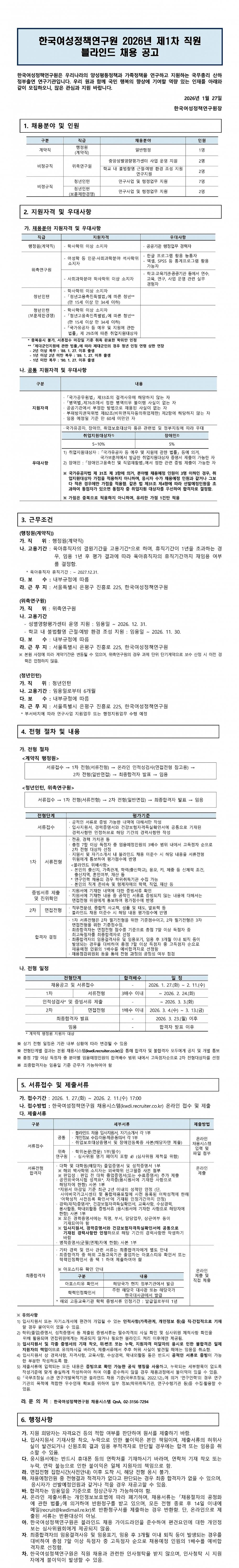 한국여성정책연구원 2026년 제1차 직원(계약직 행정원, 위촉연구원, 청년인턴) 블라인드 채용 공고